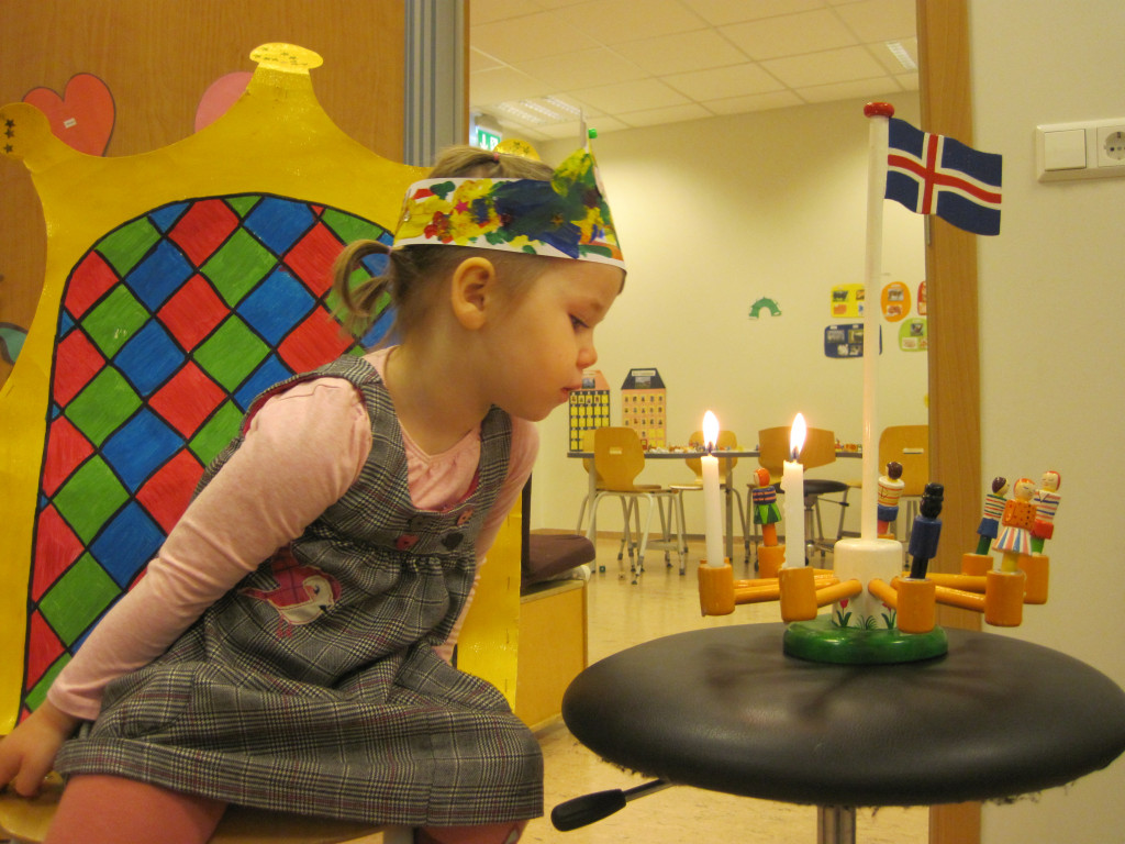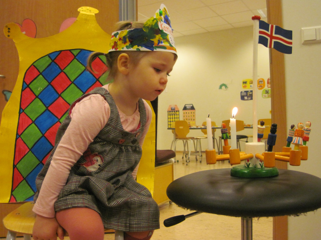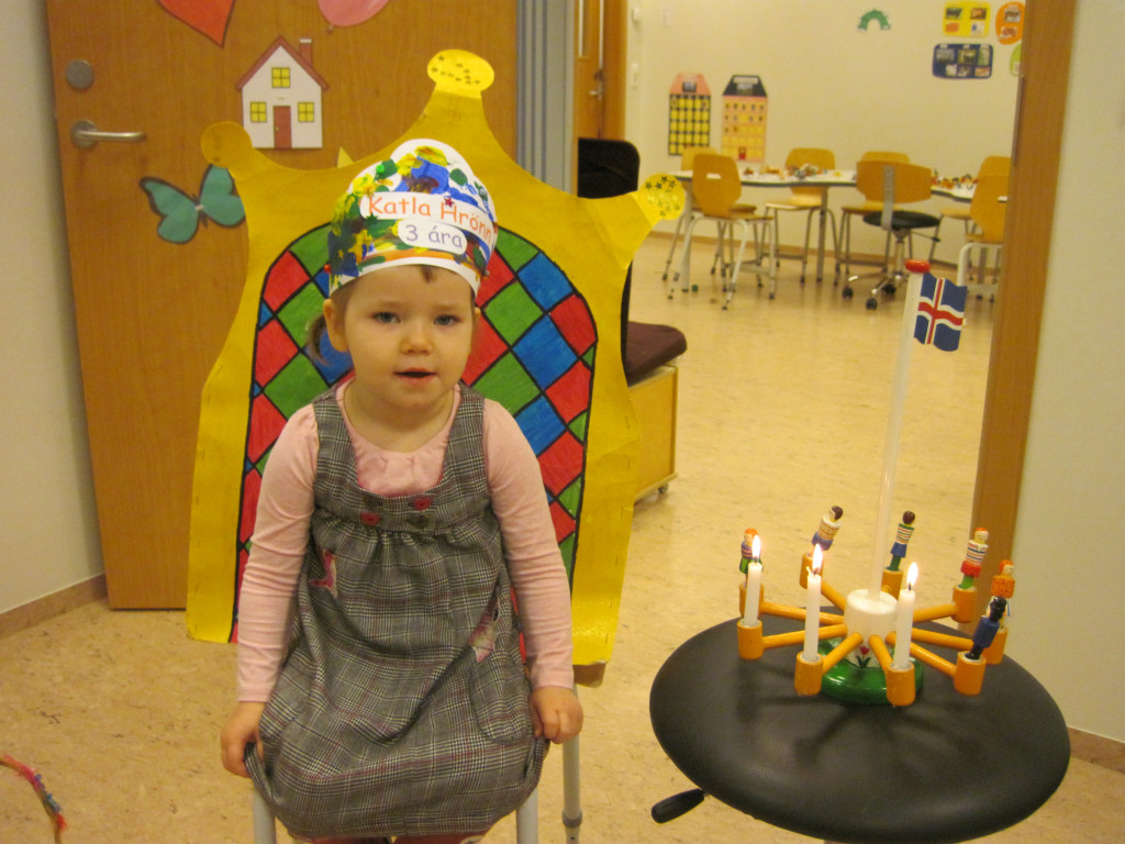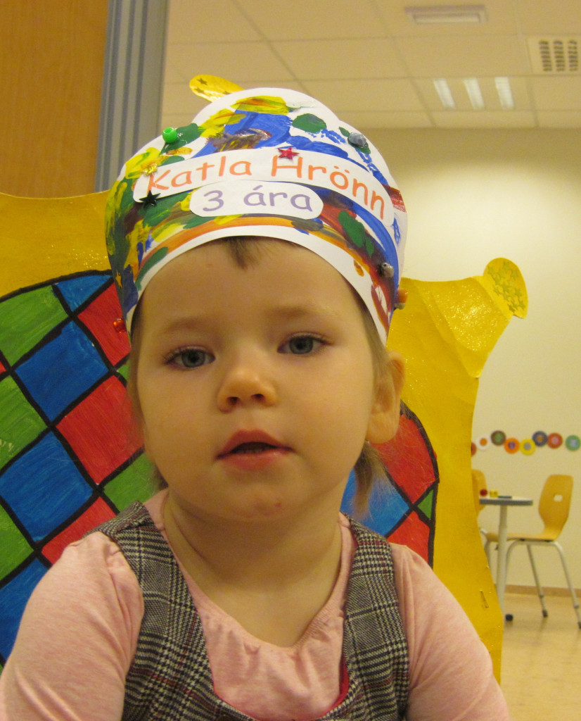 Í dag héldum við upp á 3 ára afmælið hennar Kötlu Hrannar. Katla Hrönn málaði á flottu kórónuna sína og flaggði íslenska fánanum í tilefni dagsins. Í ávaxtastundinni sungum við fyrir hana afmælissönginn, hún hefur stækkað í nótt og þetta er afmæliskveðja. Eftir sönginn fengu sér allir ávexti úr ávaxtakörfunni.