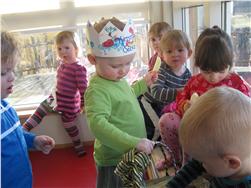 Hann var búin að búa sér til kórónu og setti hana upp í tilefni dagsins. Í ávaxtastundinni og á söngfundi sungum við fyrir hann afmælissönginn, hann hefur stækkað í nótt og þetta er afmæliskveðja. Síðan bauð hann öllum á Skýjaborg upp á ávexti úr afmæliskörfunni. Flögguðum fyrir hann í tilefni dagsins.