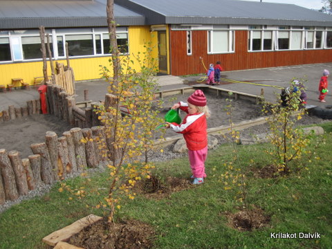 Nú George og Sharka lokið vinnu við lóðina þetta árið en munu mæta galvösk næsta sumar til að halda verkinu áfram. Það er í okkar hlut að hugsa um lóðina, lagfæra það sem færist til og vökva plöntur svo þær haldi lífi hér hjá okkur. Börnin voru áhugasöm á föstudaginn þegar þau vökvuðu runna og tré sem nýlega voru sett niður og fóru ófáar ferðir með garðkönnur fullar af vatni um lóðina. Hvað er skemmtilegra en vatn og pínu sull þegar maður er ungur og leikur sér.
