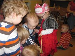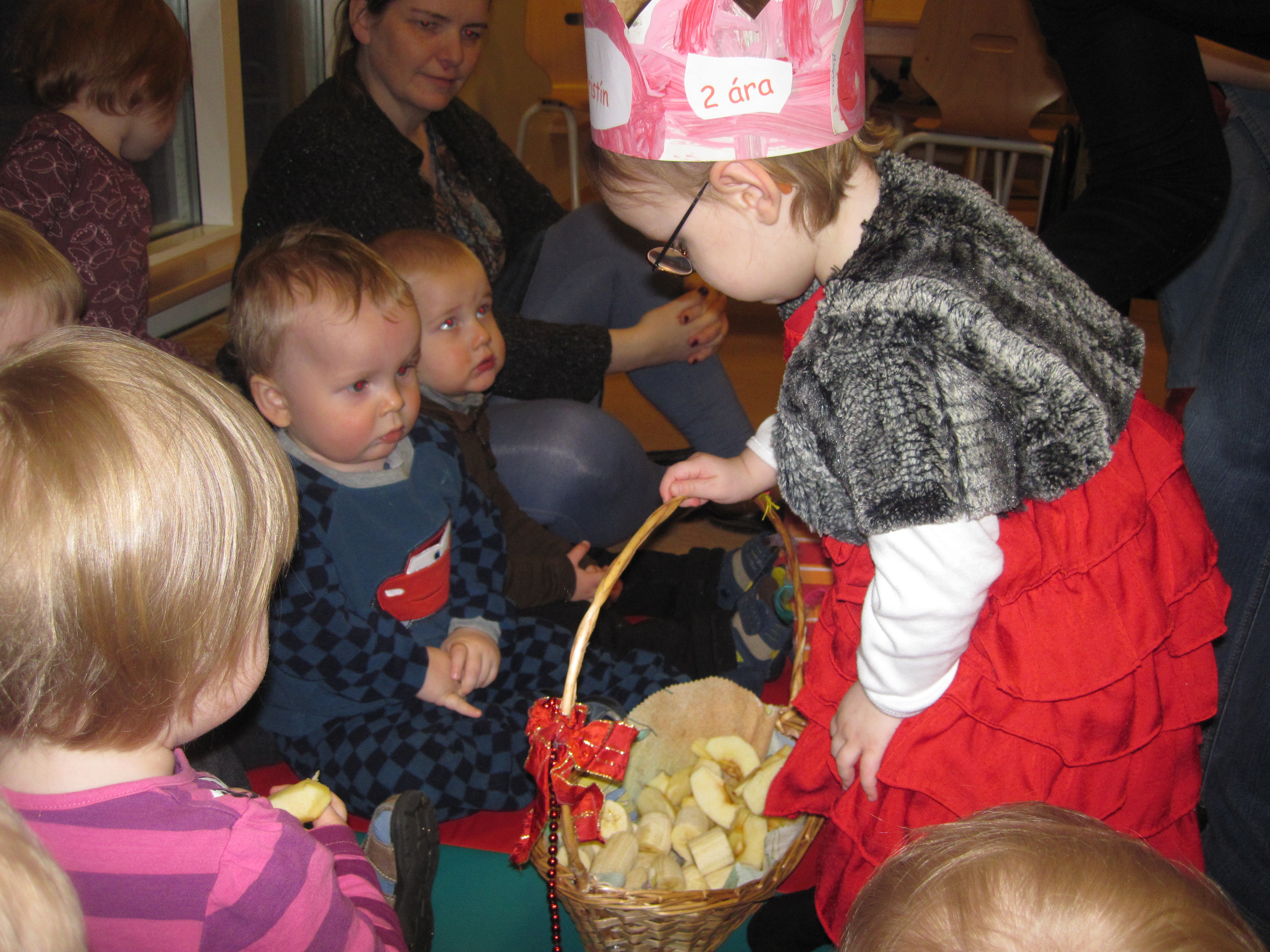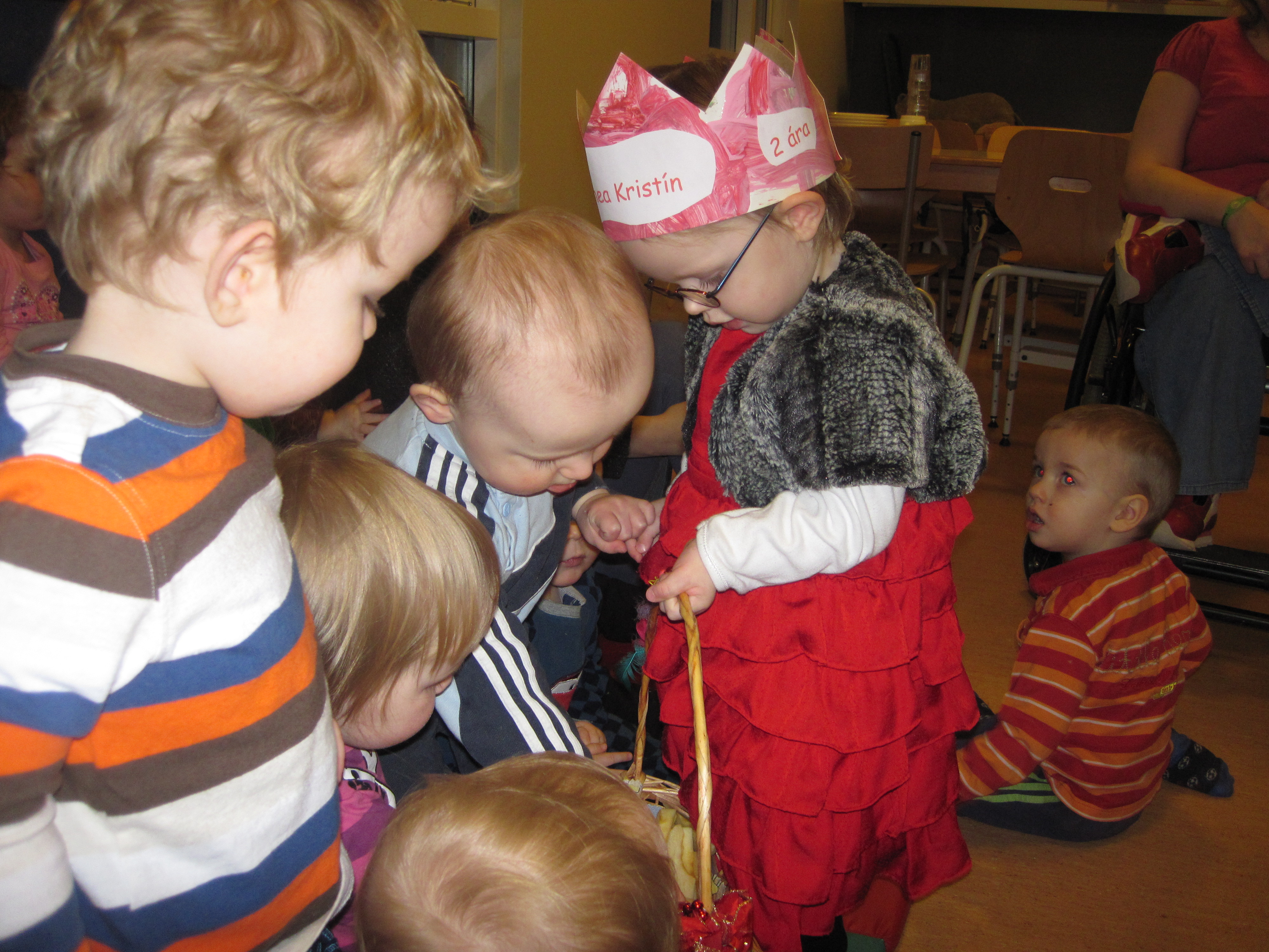 Hún var búin að búa sér til kórónu og setti hana upp í tilefni dagsins. Í ávaxtastundinni sungum við fyrir hana afmælissönginn, hún hefur stækkað í nótt og þetta er afmæliskveðja. Síðan bauð hún öllum á Skýjaborg upp á ávexti úr afmælisávaxtakörfunni. Flögguðum fyrir hana í tilefni dagsins.