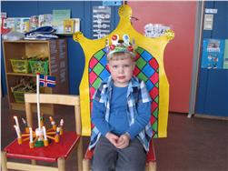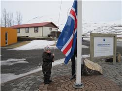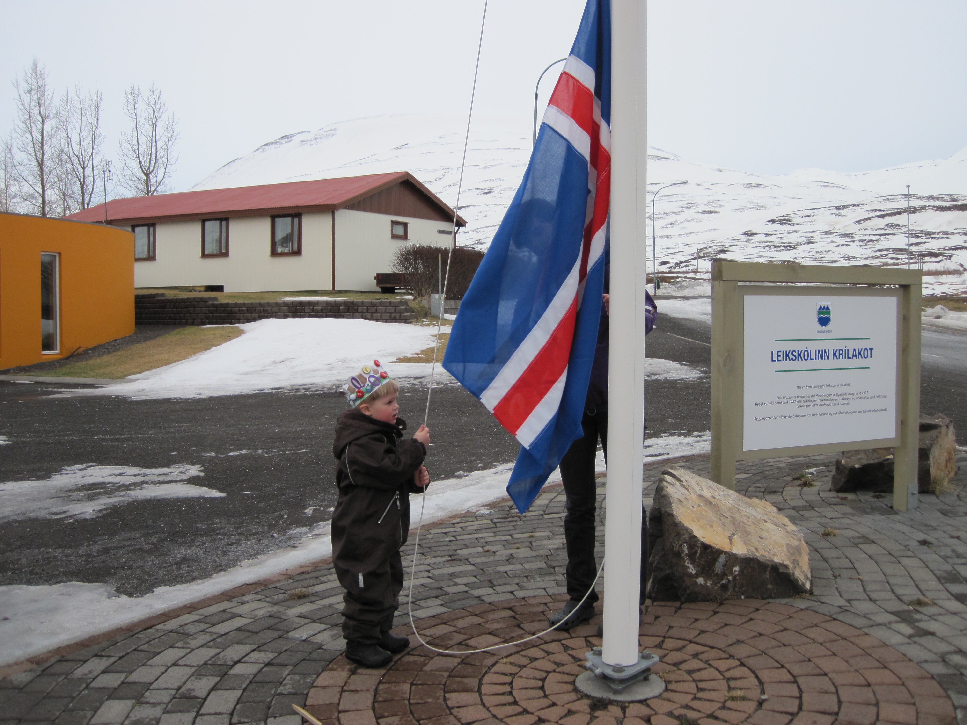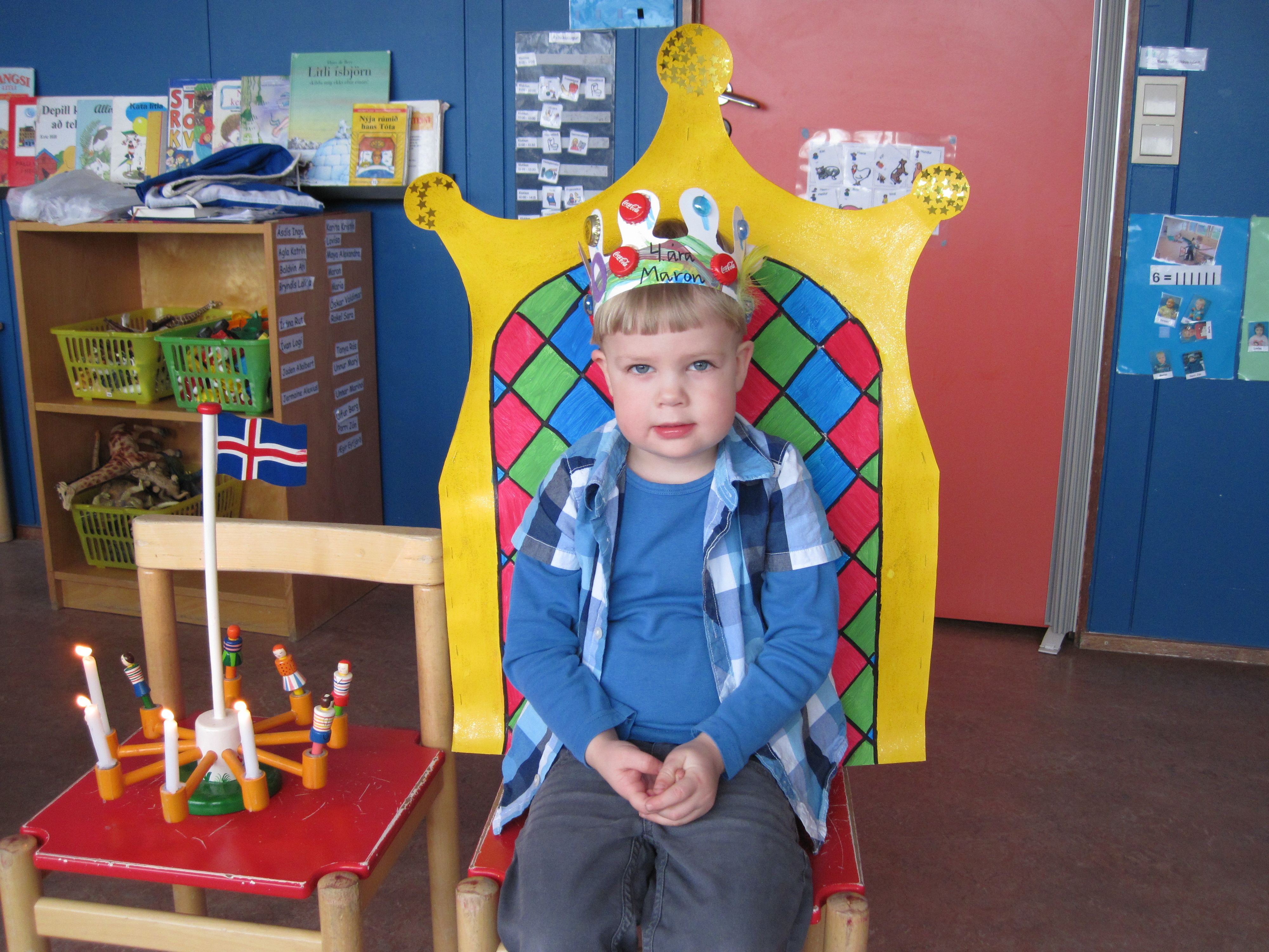 Maron málaði sér kórónu og flaggaði íslenska fánanum. Í ávaxtastundinni sungum við fyrir hann afmælissönginn og hann blés á kertin fjögur.