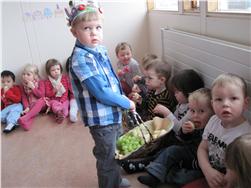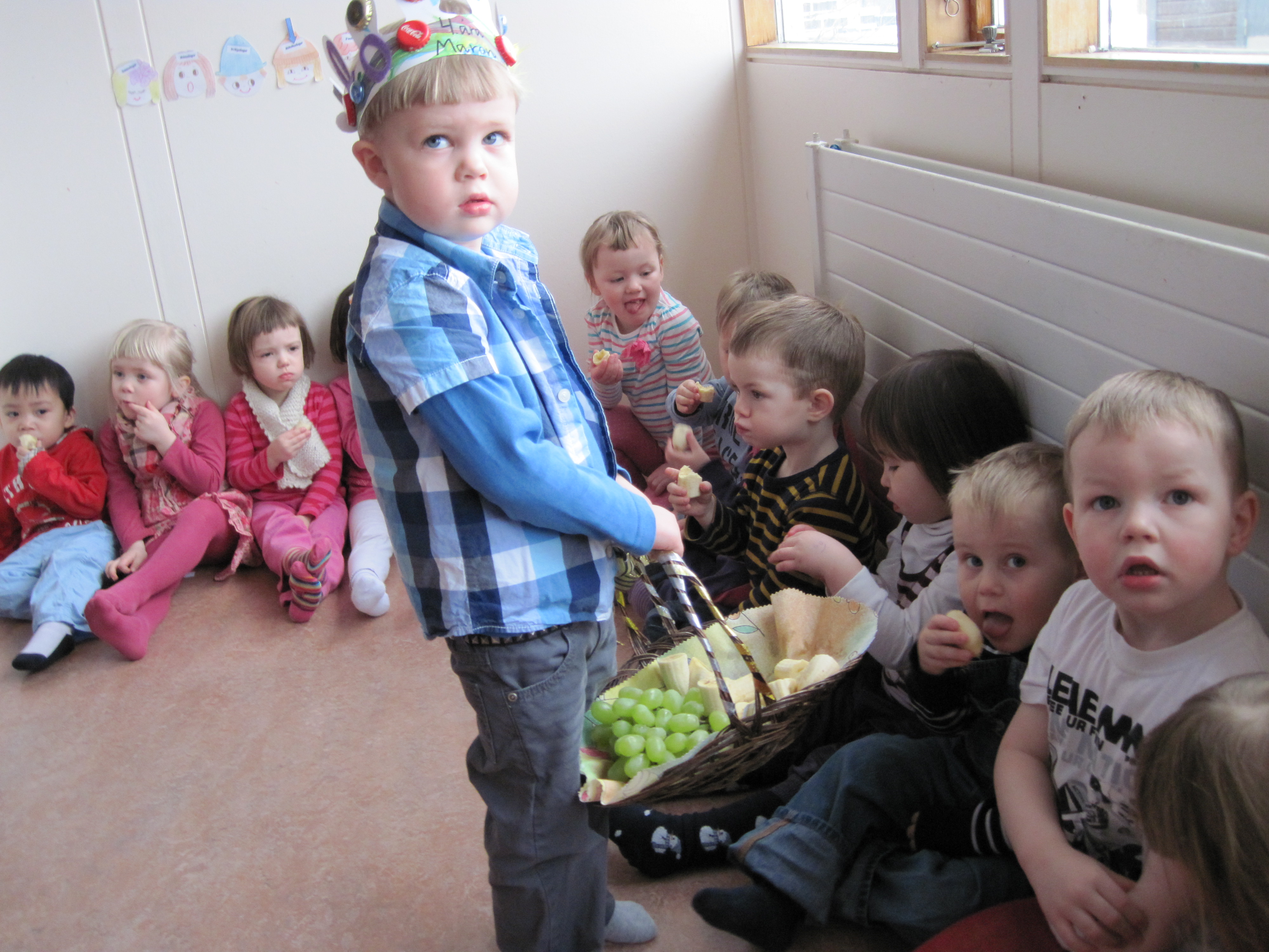 Eftir sönginn bauð Maron öllum á Skakkalandi upp á ávexti úr afmæliskörfunni.