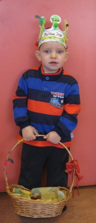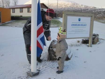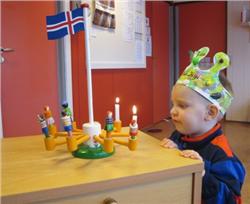Matthías Helgi málaði sér kórónu og flaggaði íslenska fánanum. Í ávaxtastundinni sungum við fyrir hann afmælissönginn og hann blés á kertin tvö.