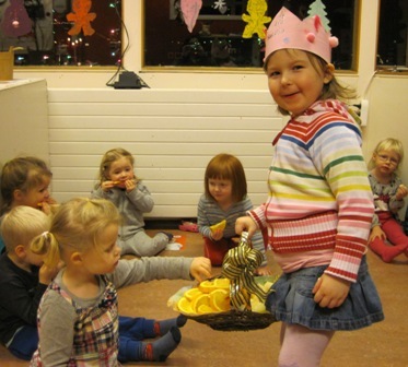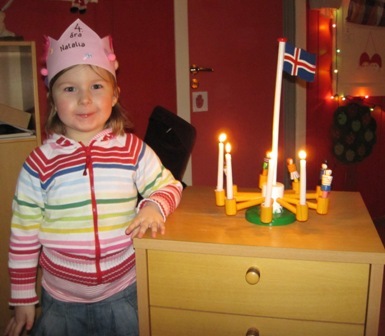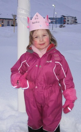 Natalia málaði sér kórónu og flaggaði íslenska fánanum. Í ávaxtastundinni sungum við fyrir hana afmælissönginn og hún blés á kertin fjögur.