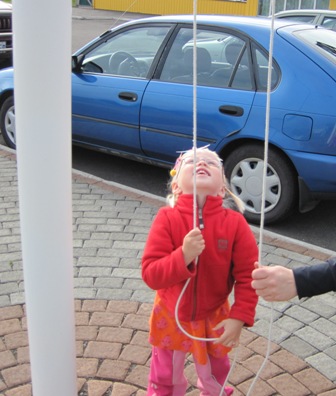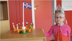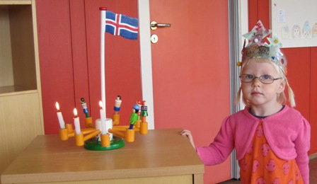Í ávaxtastundinni sungum við fyrir hana afmælissönginn og hún blés á kertin þrjú. Eftir sönginn bauð Rakel Bára öllum á Hólakoti upp á ávexti úr afmælisávaxtakörfunni.