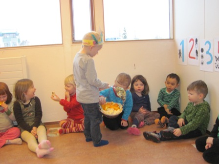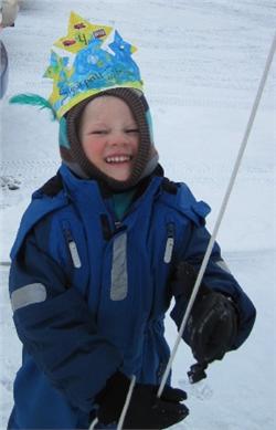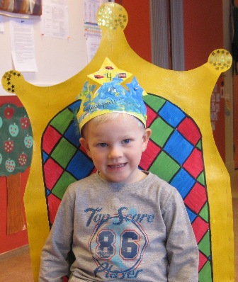 Sigurpáll Steinar málaði sér kórónu og flaggaði íslenska fánanum. Í ávaxtastundinni sungum við fyrir hann afmælissönginn og hann blés á kertin fjögur.