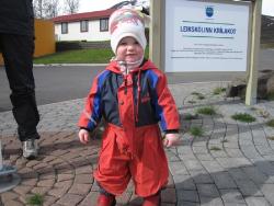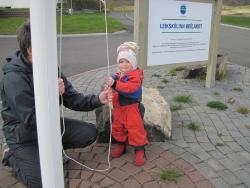 Snælaug bjó sér til kórónu og fór út að flagga íslenska fánanum.