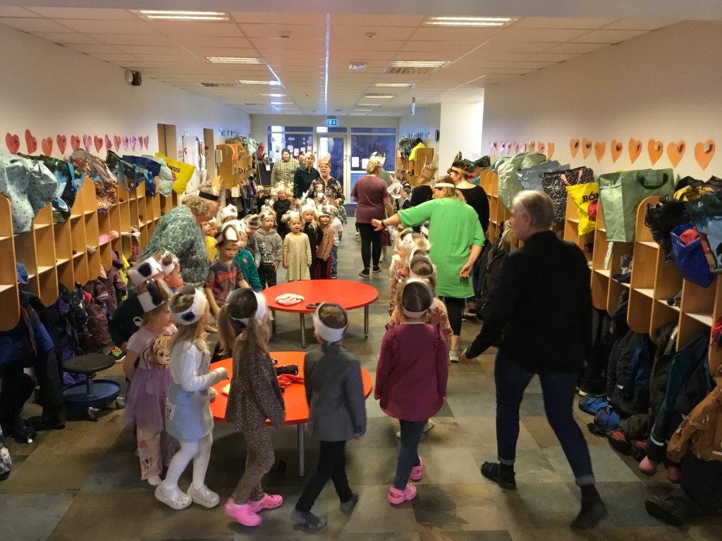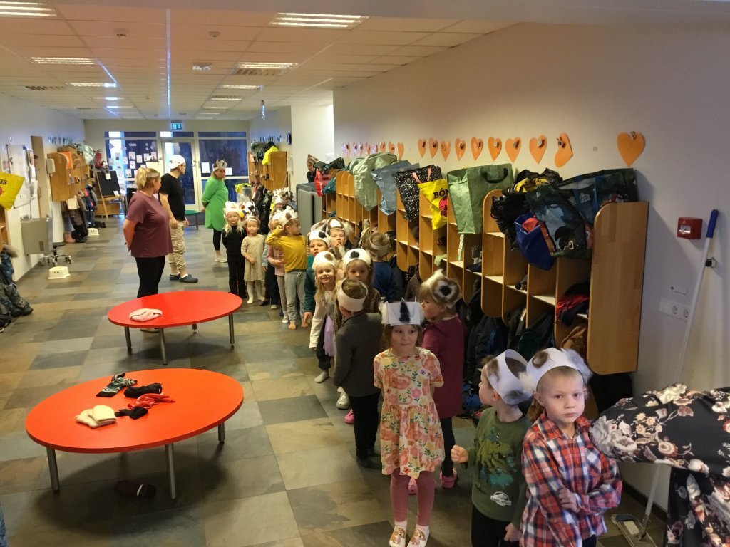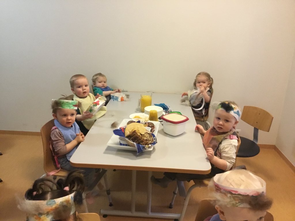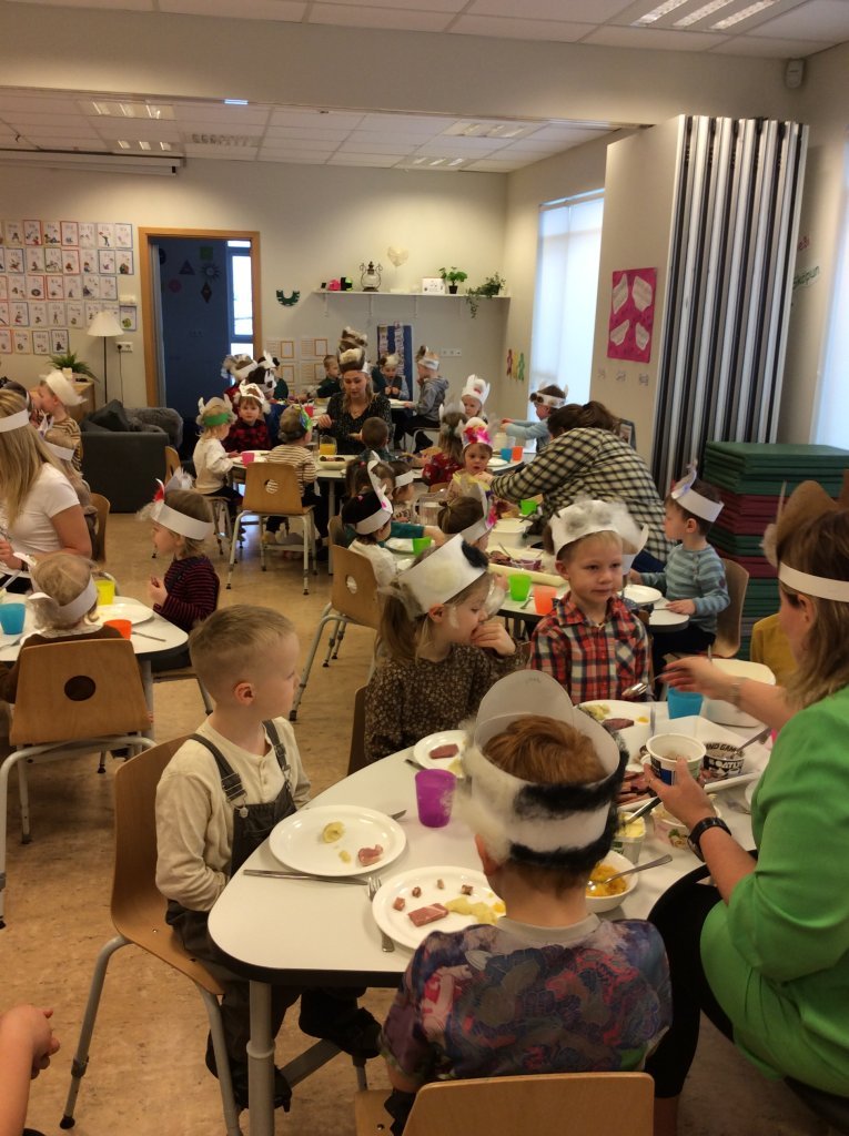 Í dag var haldið þorrablót á Krílakoti. Allir bjuggu til þorrahjálm og voru með í dag. Á Skýjaborg var sungið og allur matur smakkaður, á hinum deildunum var marserað og sungið áður en allir settust við matarborðið. Í boði var hangikjöt, saltkjöt, hákarl, harðfiskur, slátur og fleira góðgæti.