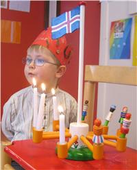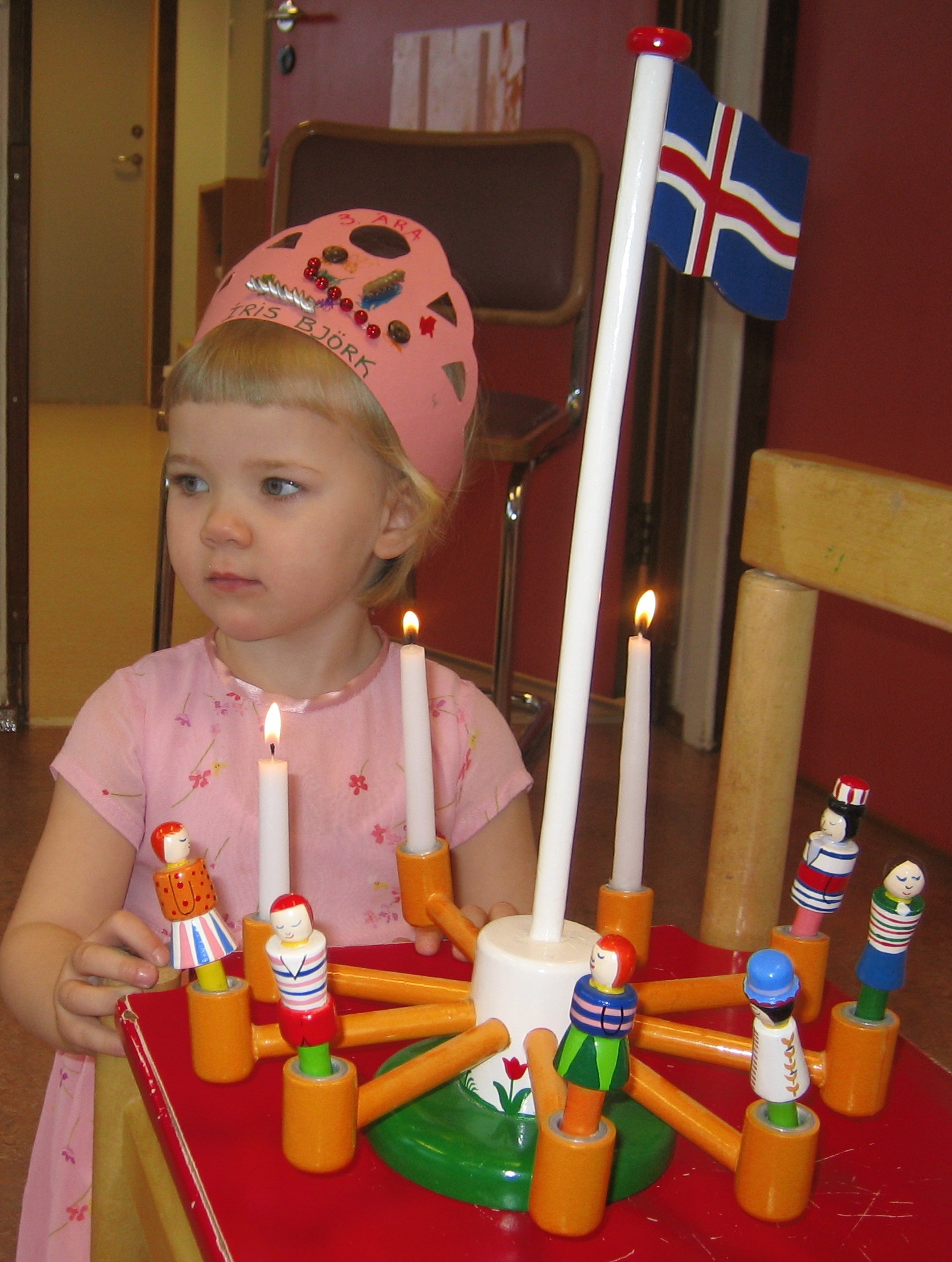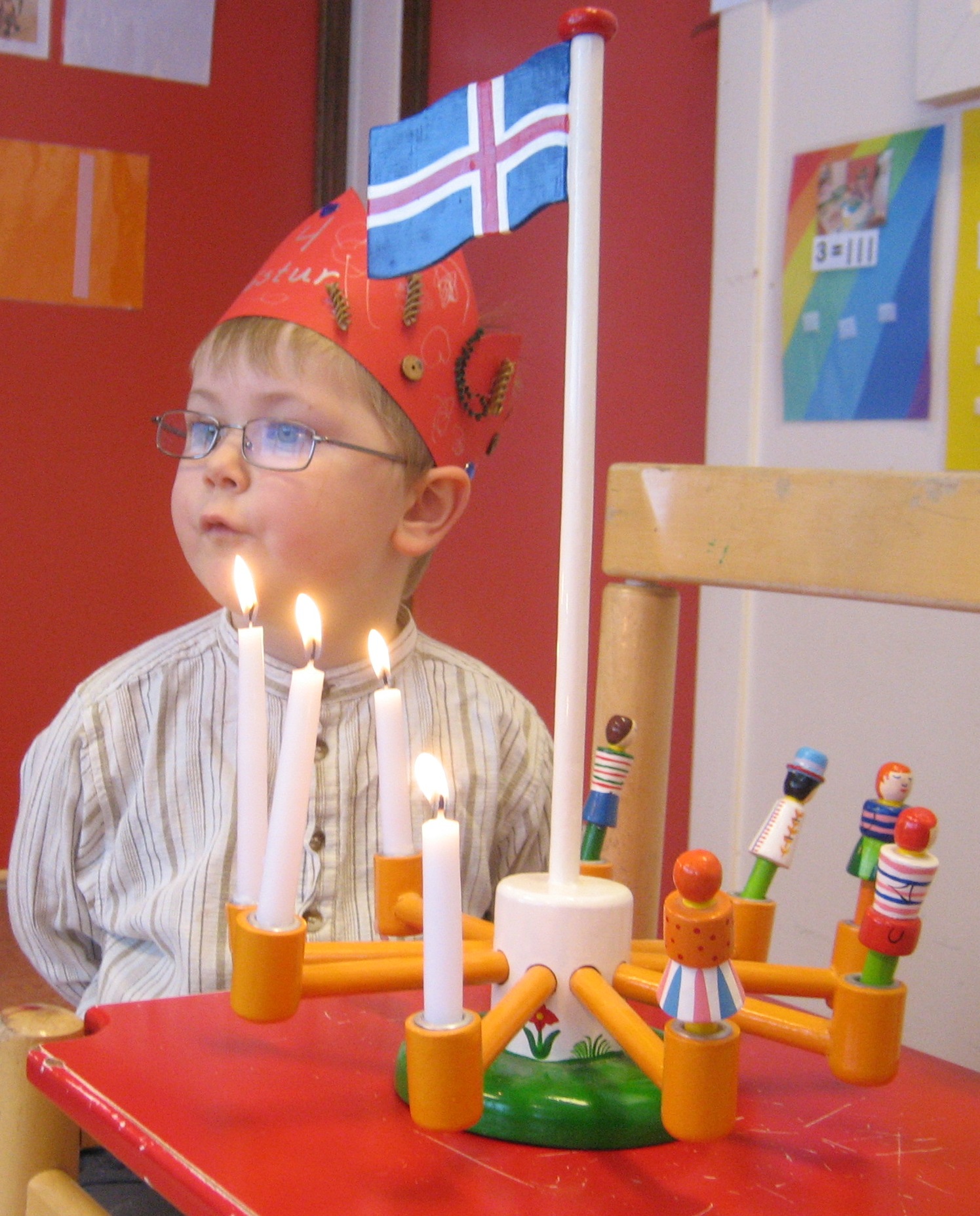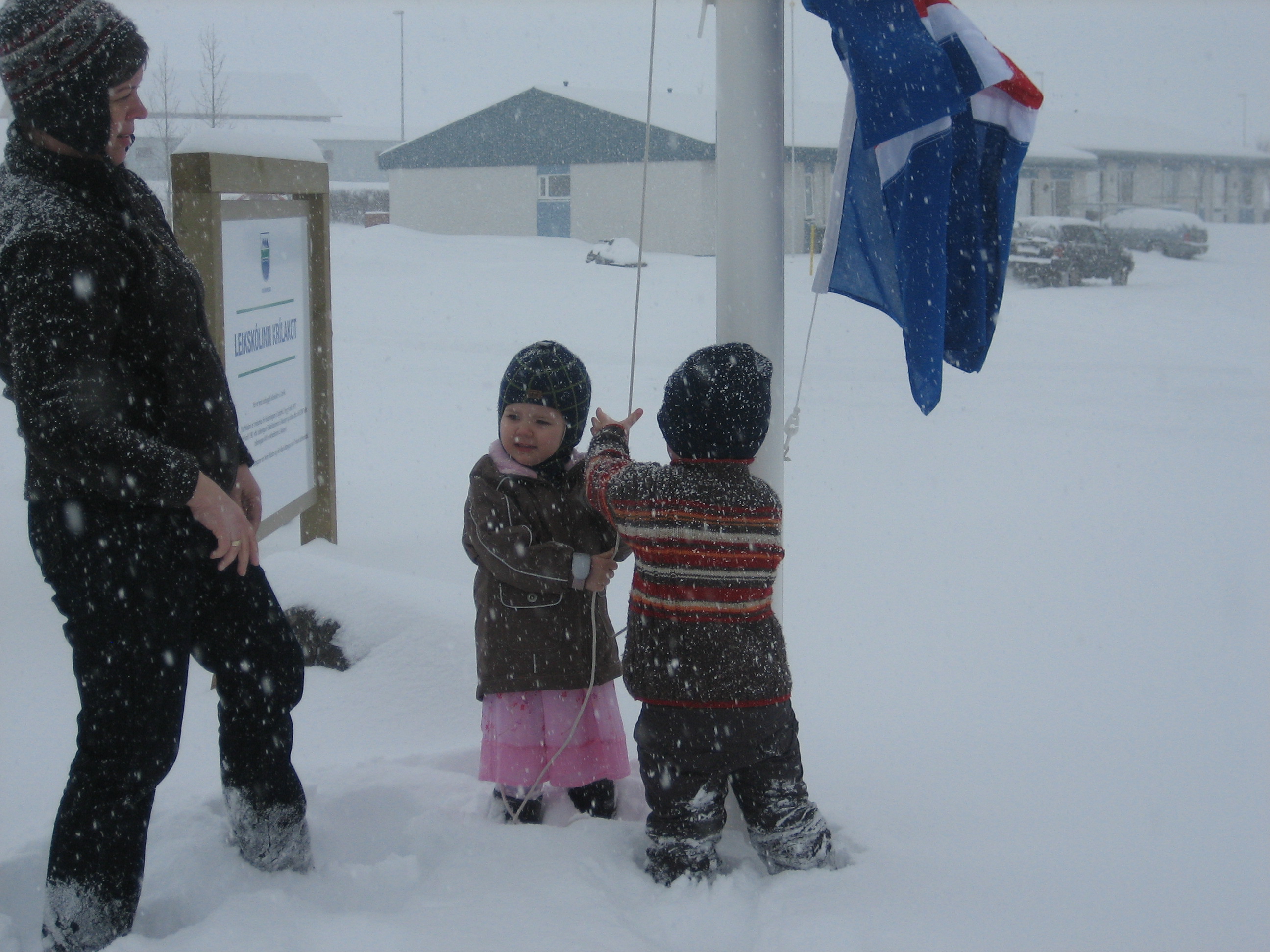 Í gær áttu tvö börn afmæli hjá okkur það voru þau Þröstur sem varð 4. ára og Íris Björk sem varð 3. ára. Þau byrjuðu daginn á því að búa sér til kórónur og fóru síðan út að flagga í snjókomunni. Eftir það sungu börnin fyrir þau afmælissönginn og þau blésu á kertin þrjú og fjögur. Síðan buðu þau öllum upp á ávexti, Þröstur bauð upp á granantepli sem hann kom með að heiman. Einnig voru þau þjónar dagsins. Við óskum þeim til haminju með daginn.