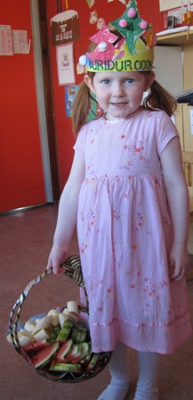 Eftir sönginn bauð Þuríður Oddný öllum á Hólakoti upp á ávexti úr ávaxtakörfunni.