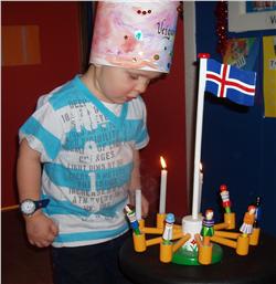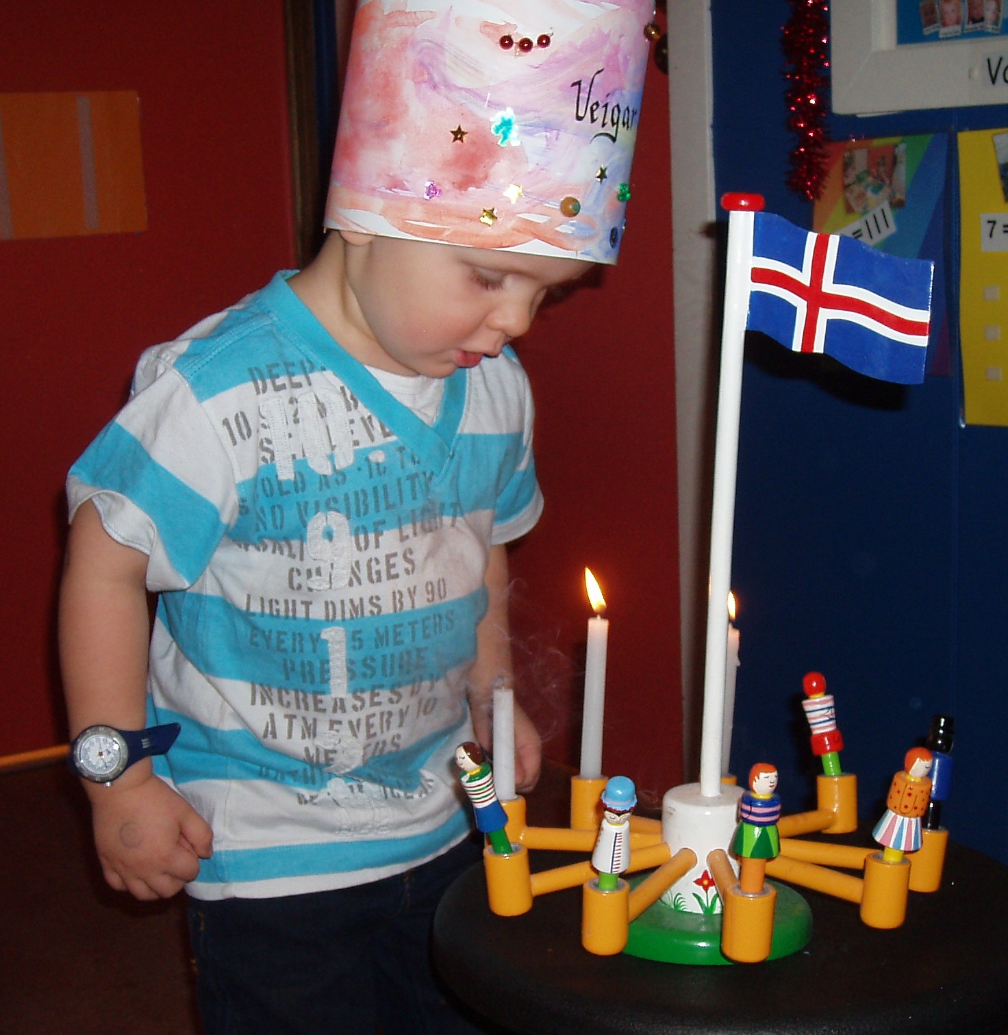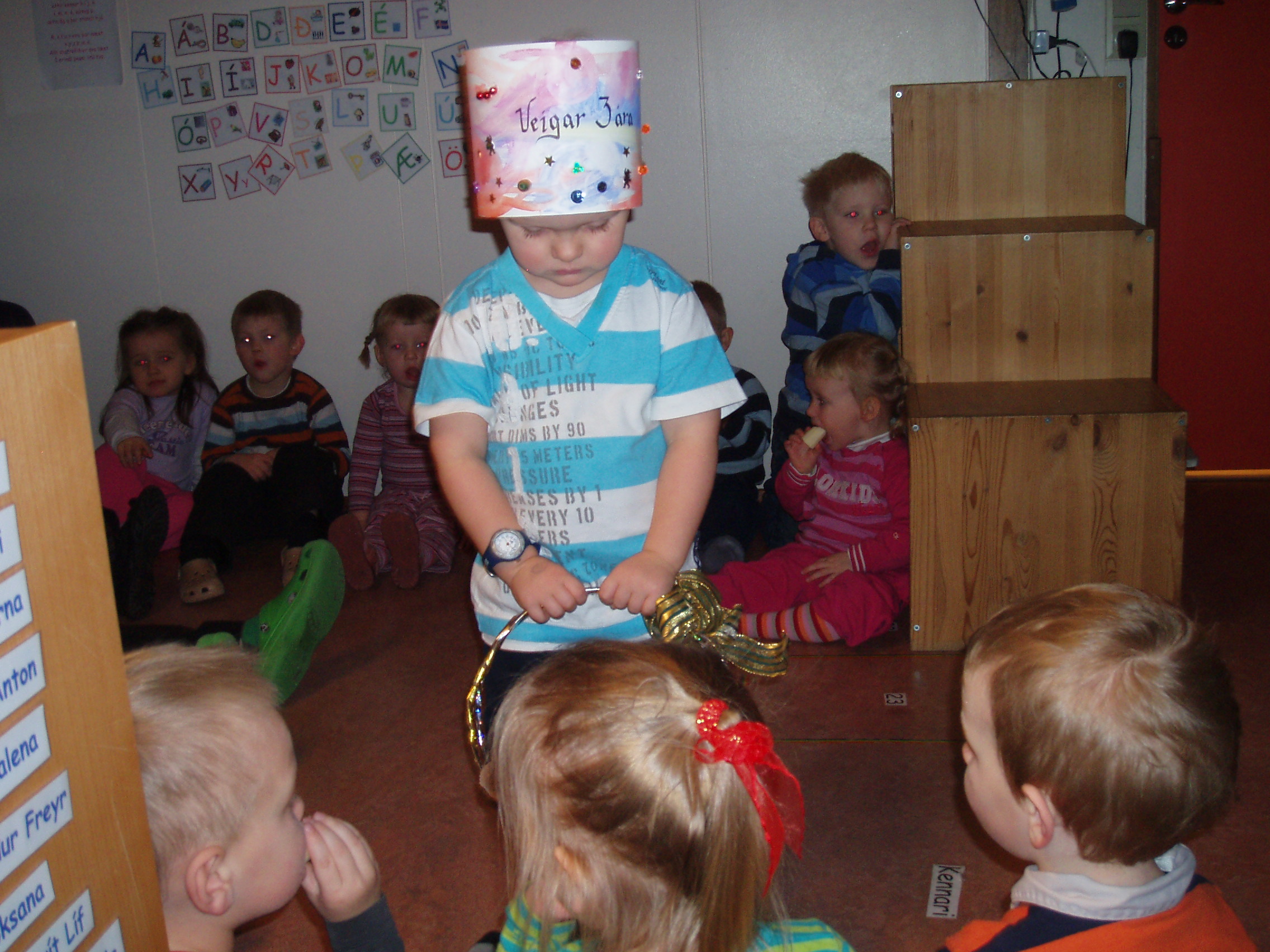 Á föstudaginn héldum við upp á 3. ára afmælið hans Veigars en hann á afmæli 21. desember. Hann byrjaði daginn á því að búa sér til kórónu, bauð öllum upp á ávexti og svo sungu allir afmælissönginn í tilefni dagsins. Einnig fór hann út og flaggaði og var þjónn dagsins. Við óskum honum innilega til hamingju með daginn frá öllum á Skakkalandi.